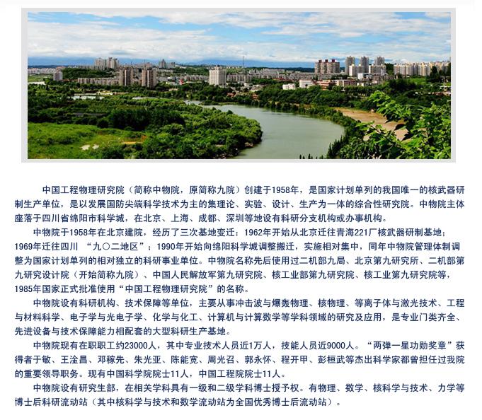 中國工程物理研究院(China Academy Of Engineering Physics),簡稱"中物院",是國家科研計劃單列的中國唯一的核武器研制生產(chǎn)單位,是以發(fā)展國防尖端科學技術(shù)為主的集理論、實驗、設(shè)計、生產(chǎn)為一體的綜合性研究院。